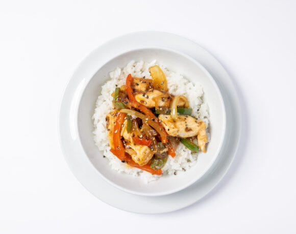- In the center of the rice, portion 1 cup of black pepper chicken with vegetables.