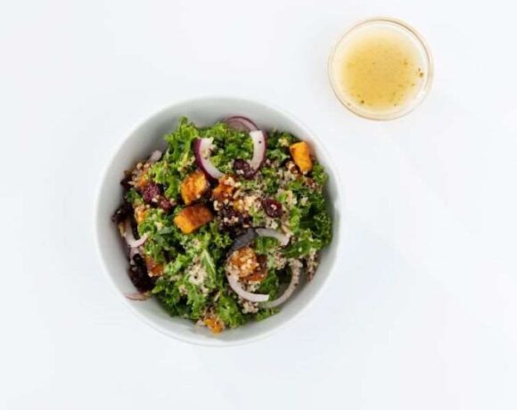 - In a large bowl add the 1/4 cup quinoa, 1/4 cup butternut squash, 1 tablespoon sunflower seeds, 1 cup kale, 1 tablespoon cranberries, and 1 tablespoon red onions. Mix well and add to entree bowl.
