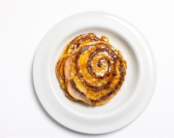 - Place two pancakes, cinnamon swirl facing up, on a plate and slightly overlap them. Drizzle each with icing – about 2 tablespoons per pancake – or as much as you like.