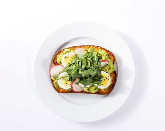 - Toast the bread. Smash 1/4 cup of the avocado mix on the slice of the toasted bread. Next, lay 1 egg sliced all over the smashed avocado. Next layer 1 Tbsp. of sliced radishes in between the egg slices. Sprinkle 1/8 tsp of everything bagel seasoning over the toast for garnish. Top with 2 Tbsp. of arugula.