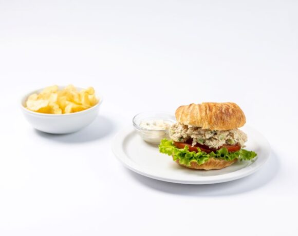 - Toast the croissant. Once the croissants are toasted, place them on your cutting board or work surface. Top the bottom half with 1 lettuce leaf, then 2 slices of tomato, and 3 oz. of chicken salad. Finish with the top of the croissant. Serve with 2 oz. lemon basil mayonnaise on the side.