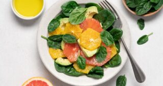 Bright grapefruit and orange segments layered over baby spinach