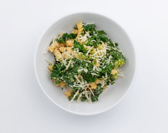 - In a bowl, scoop 1.5 cups of pasta mixture into the center of the plate, then garnish with 1 tsp of parmesan cheese and 1/2 tsp of parsley.