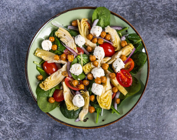 A vibrant mix of fresh spinach, artichokes, roasted garbanzo beans, boursin cheese cubes, onion, tomatoes and finished with green goddess dressing
