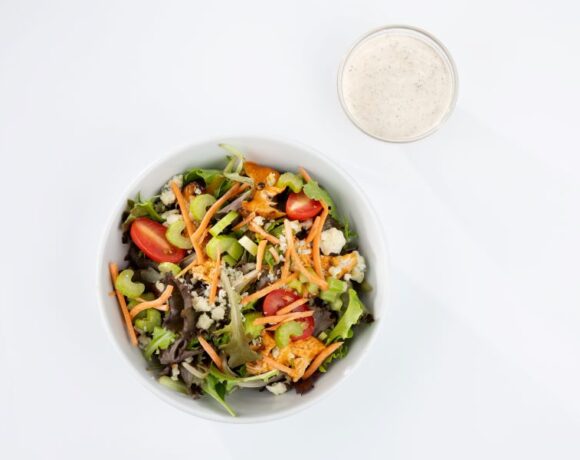 - Sprinkle salad with 1 Tbsp. of blue cheese, 6 grape tomato halves, 1 Tbsp. of diced celery, 1 Tbsp. of shredded carrot and 3 oz. of sliced buffalo chicken.