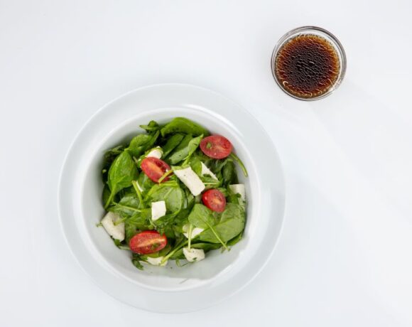 - Top spinach with 1/2 cup of the tomato mozzarella mixture. Garnish with 1 teaspoon of basil and sprinkle with 1/8 teaspoon of black pepper.