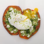 In a bowl, mash avocado with lime zest and juice. Spread mashed avocado evenly onto both slices of sweet potato. Sprinkle each slice with feta cheese and cilantro. Top with egg, cut in half and serve immediately.