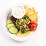 Scoop 1/2 cup of tabbouleh in the center of the plate. Place 2 tbsp of tzatziki in ramekin at the top of the plate.