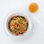 In an entree bowl, add 1 oz. of sesame ginger dressing, 2 oz. of lo mein noodles, 1/4 cup of Bok choy, 1/4 cup of snow peas, 1/4 cup of red bell peppers, 1/4 cup of carrots, 2 Tbsp. of green onions, 1 Tbsp. of cilantro, 1 tsp. of lime juice, 1/2 tsp. sesame seeds and 1 Tbsp. red onion, then toss to combine.